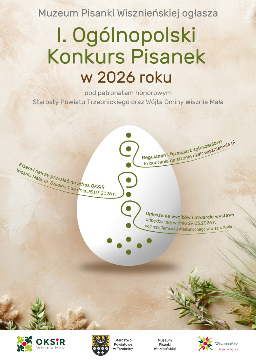 Home Aktualności I. Ogólnopolski Konkurs Pisanek w 2026 roku pod patronatem honorowym Starosty Powiatu Trzebnickiego oraz Wójta Gminy Wisznia Mała 19 lutego 2026 w Kultura REGULAMIN KONKURSUPobierz FORMULARZ ZGŁOSZENIOWYPobierz konkurs, pisanka, wielkanoc