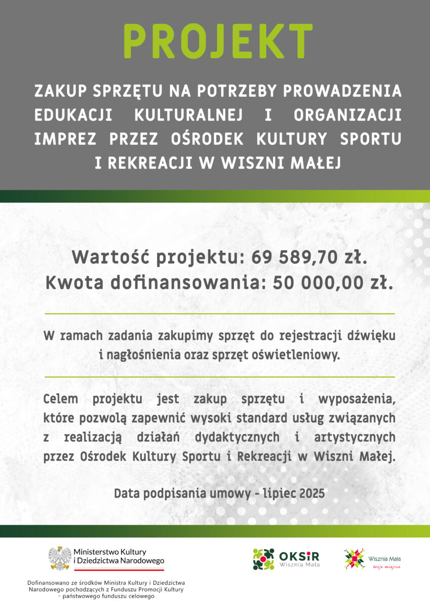 Home Aktualności Projekt -zakup sprzętu na potrzeby prowadzenia edukacji kulturalnej i organizacji imprez przez Ośrodek Kultury Sportu i Rekreacji w Wiszni Małej 14 maja 2025 w Informacje, Projekty dofinansowanie, informacja