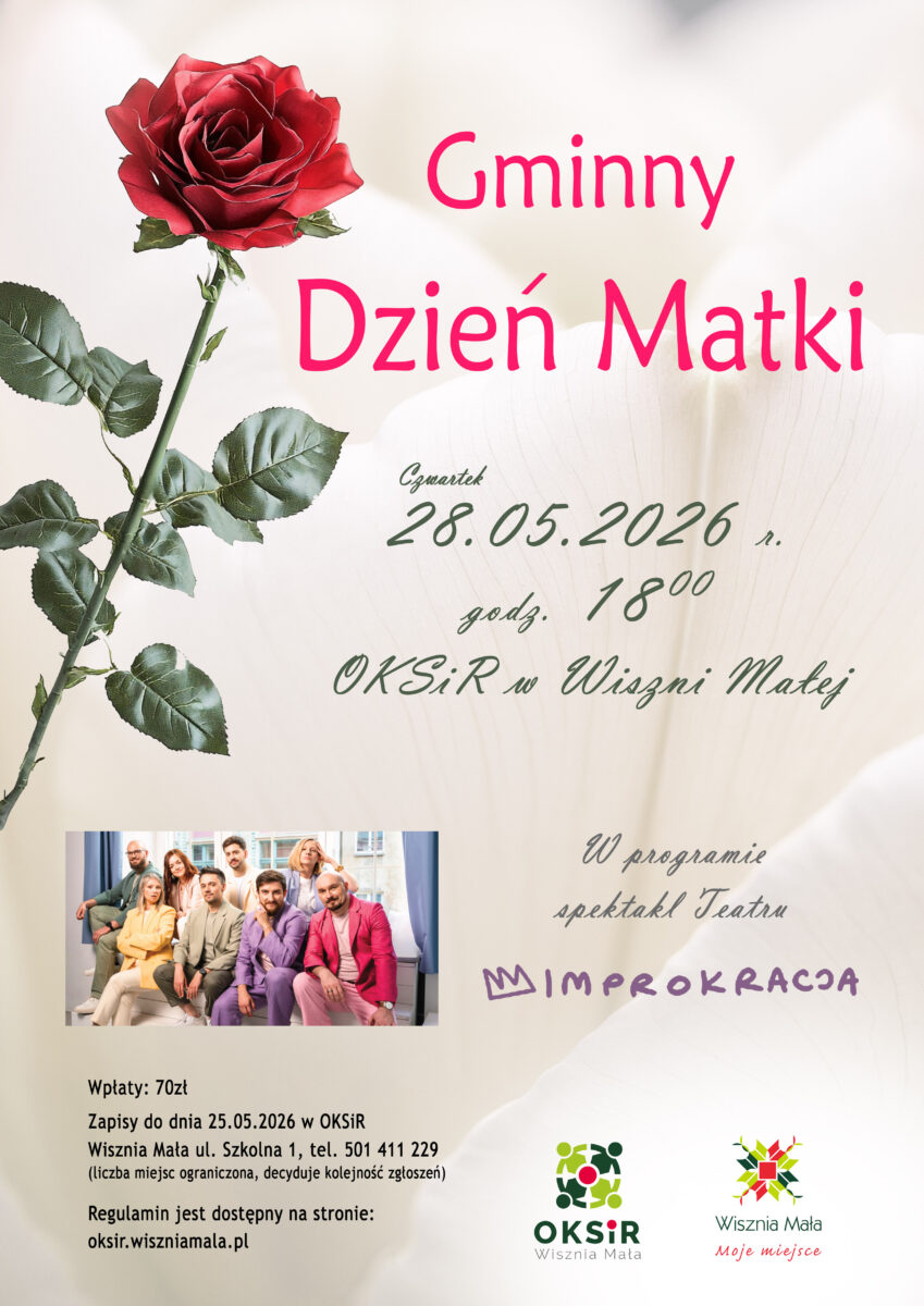 Home Wydarzenia Gminny Dzień Matki w Wiszni Małej w Wydarzenia Data 28 maja 2026 Godzina 18:00 - 20:00 Ośrodek Kultury Sportu i Rekreacji w Wiszni Małej ul. Szkolna 1, 55-114 Wisznia Mała Do pobrania: RegulaminPobierz dzień matki, Wisznia Mała