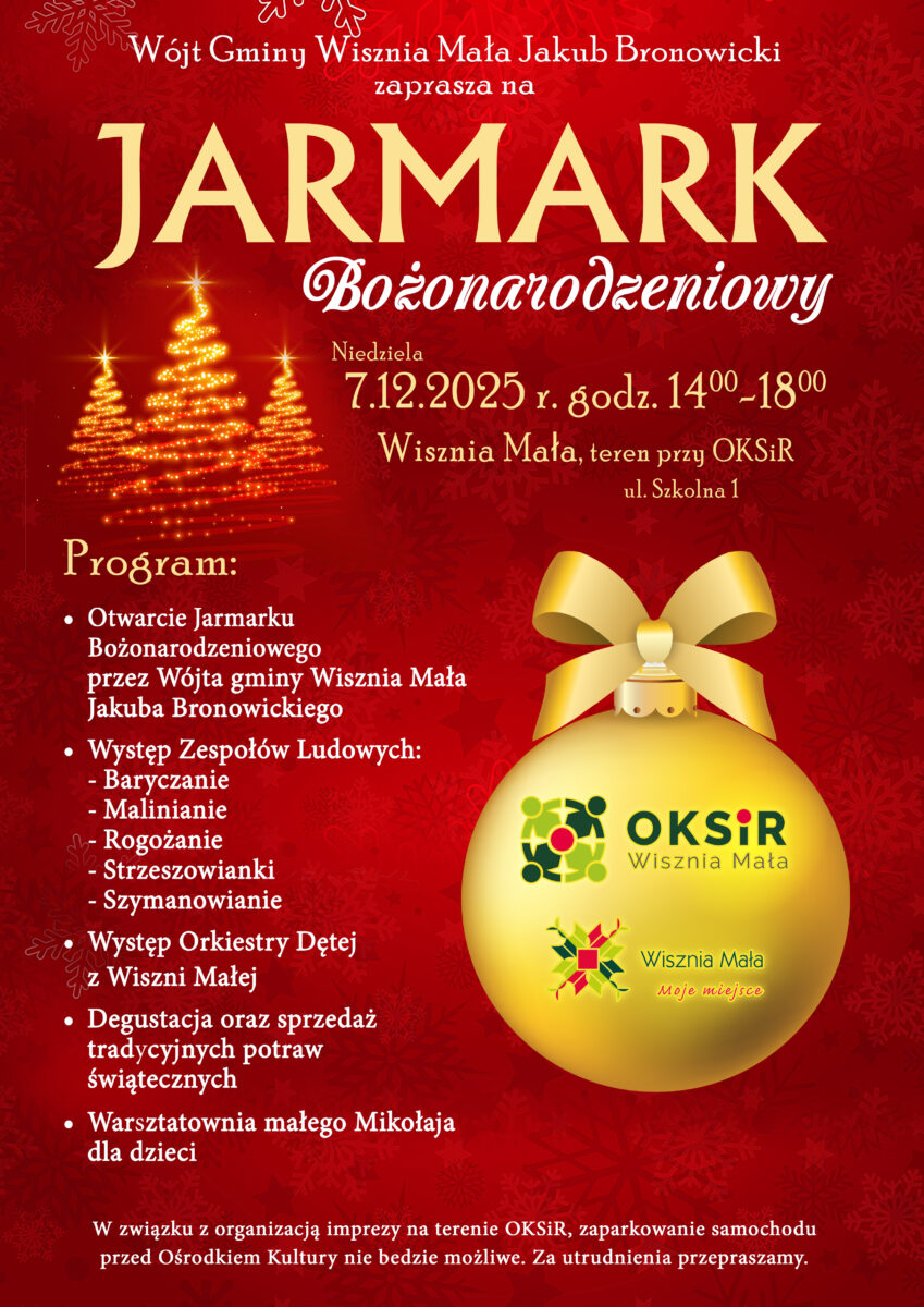 Home Wydarzenia Jarmark Bożonarodzeniowy 2025 w Wiszni Małej w Wydarzenia Data 7 grudnia 2025 Godzina 14:00 - 18:00 RegulaminPobierz Dla wystawców: KARTA ZGŁOSZENIAPobierz KARTA ZGŁOSZENIAPobierz (format ODT) jarmark bożonarodzeniowy, Wisznia Mała