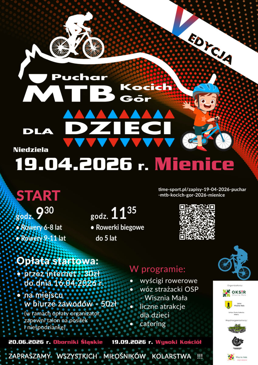 Home Wydarzenia Puchar MTB Kocich Gór edycja V – Mienice w Sport, Wydarzenia To wydarzenie już się zakończyło. Data 19 kwietnia 2026 Godzina 08:00 - 14:00 Świetlica w Mienicach ul. Lipowa 16 Zapisy:https://time-sport.pl/zapisy-19-04-2026-puchar-mtb-kocich-gor-2026-mienice Trasa: https://mapy.com/pl/turisticka?moje-mapy&cat=aktivity&mid=69b0145a420f3247b9b3c87f&x=16.9777574&y=51.2802556&z=14 Mienice, MTB